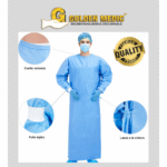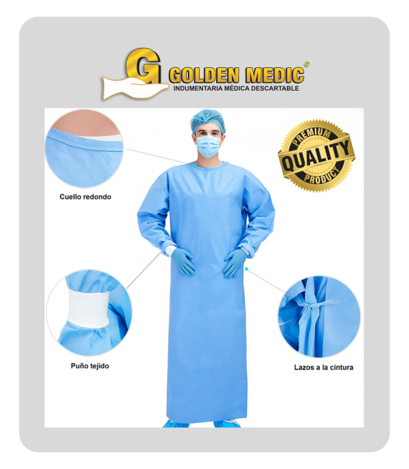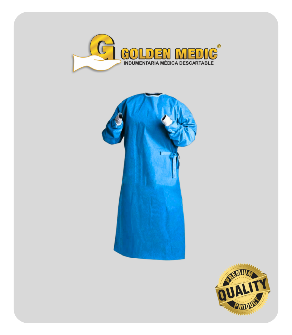 Mandil quirúrgico estéril, manga larga y puños de algodón, fácil de ponerse, diseño anatómico de ajuste perfecto, superficie extra suave, no produce molestias en la piel, confort garantizado por tiempo prolongado, avanzado material que permite una adecuada ventilación, resistencia comprobada y de gran durabilidad. El SMS proporciona una protección superior contra los líquidos, partículas, suciedad y contaminantes, al mismo tiempo que es transpirable y permeable al aire.